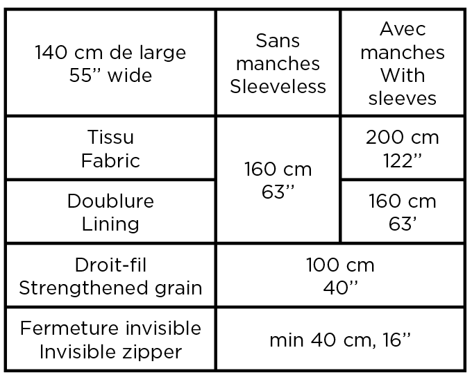 Coton, lin, soie sauvage, ottoman, brocart ou encore Jeans iront très bien à cette petite robe. Poids : 250-400 g/m2, 7.4-11.8 oz/yd2