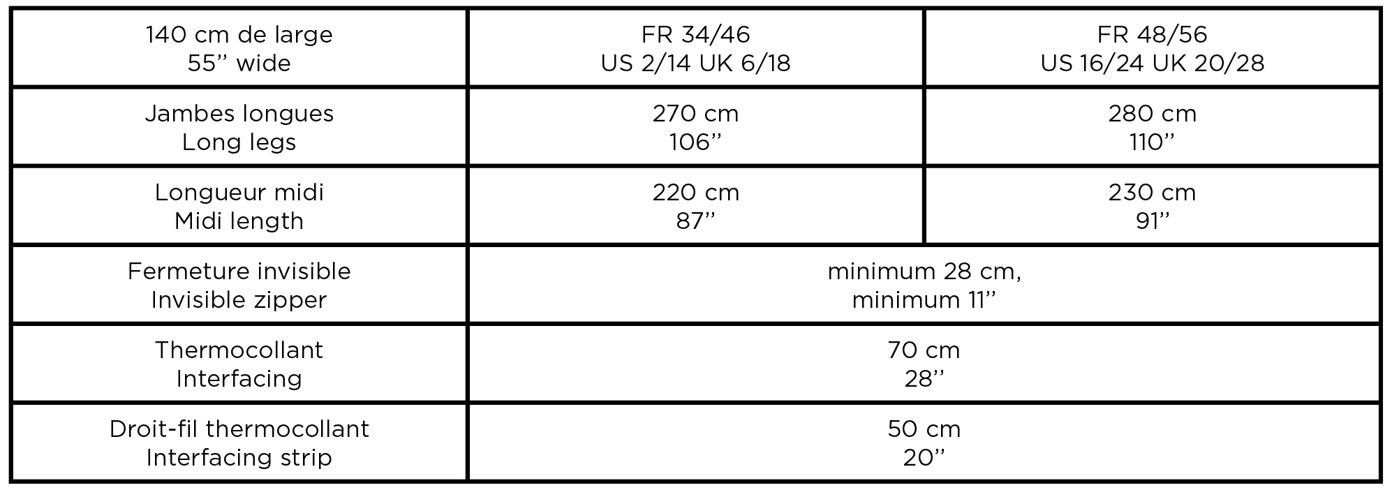 Pour ce modèle, utilisez des matières de poids moyen, fluides et non transparentes comme un crêpe ou un twill de viscose, un serge ou une popeline de coton, un tencel/lyocell, un lin/viscose. Poids : 200–350 gr/m2 (5.9–10,3 oz/yd2)