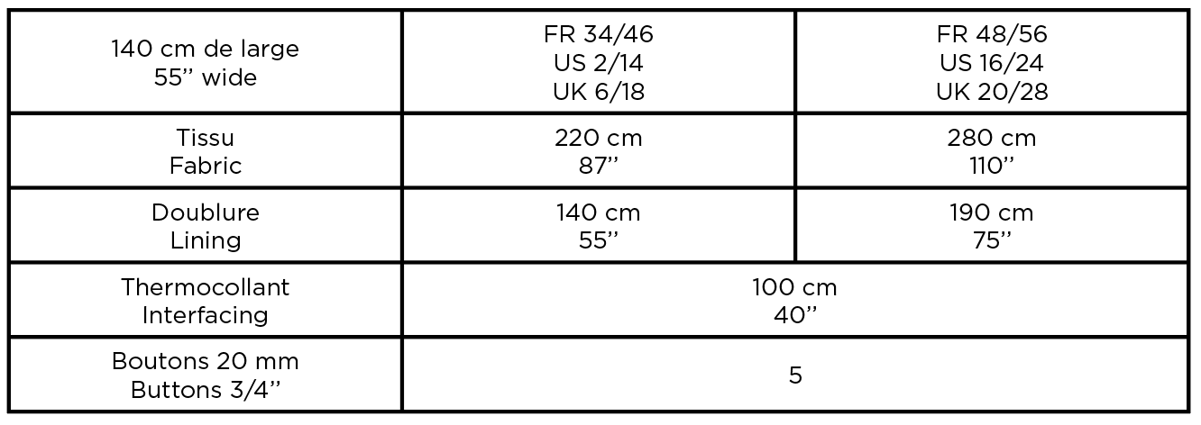 Ce patron est idéal dans tous les lainages souples ou dans un softshell pour une version mi-saison plus moderne. Poids conseillé : 300 à 500 g/m² (8.8–14.7 oz/yd²).