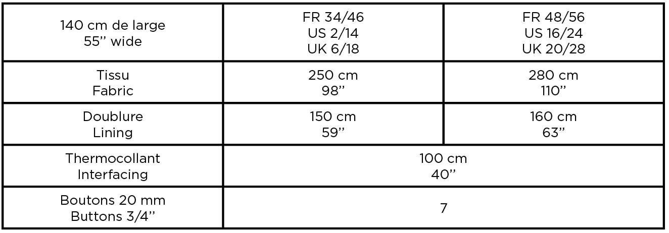 Ce modèle se prête à plusieurs interprétations : en lainage ou sofshell pour l’hiver, ou dans une toile enduite pour une version mi-saison plus légère. Son design épuré permet d’oser différents tissus, pour créer un manteau unique qui reflète votre style. Poids recommandé : 250–400 g/m2 (7.4–11.8 oz/yd2)