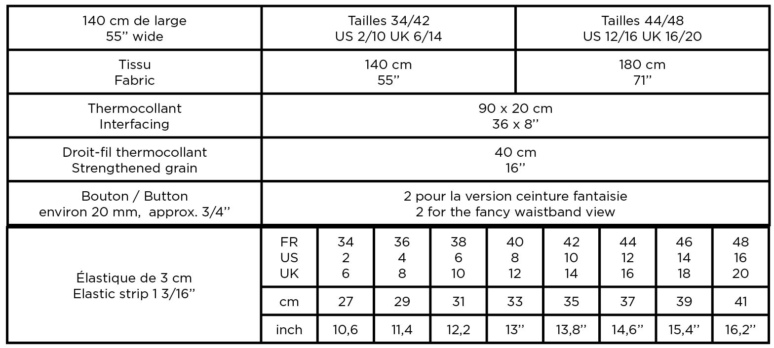 Ce modèle se décline dans une grande variété de tissus chaîne et trame : satin de coton, velours milleraies, denim, lin… L’ajout d’élasthanne est un vrai plus pour un confort optimal. Ce pantalon est déclinable à l’envie! Poids : 250–350 g/m2 (7.4–10.3 oz/yd2)