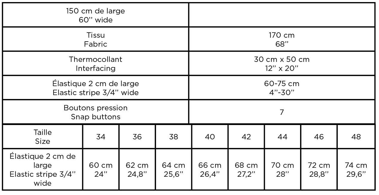 À réaliser dans une grande variété de tissus de poids moyen comme la gabardine, le satin de coton, le denim ou un damassé léger. Poids recommandé : 200 à 350 g/m² (5.9–10.3 oz/yd²).