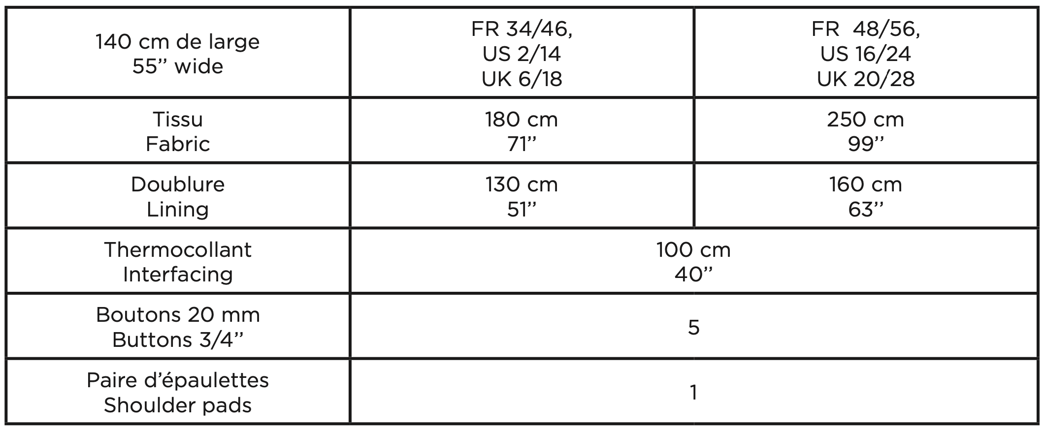 Ce patron se prête à une grande variété de matières : jacquard texturé, lainage souple, gabardine, satin de coton ou encore natté léger. Pour un look plus audacieux, optez pour un satin noir et associez-la au pantalon Perrine pour composer un smoking féminin chic, glamour et indémodable.