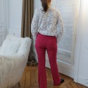 The high waist beautifully enhances the silhouette, while the flared legs elongate and balance the figure. Philippine works all year round go for shorts in summer or trousers in structured fabric for colder seasons.