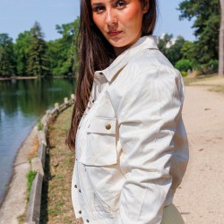 Nessa is a short jacket. This jacket, a wardrobe essential, pairs effortlessly with both dresses or skirts and pants. It will stylishly enhance your silhouette.