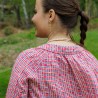 Estelle is the pattern of a bohemian chic tunic with raglan sleeves. It has a round & gathered neckline with a slit in the front. The bottom has a round shaped hem. The sleeves are elasticated.